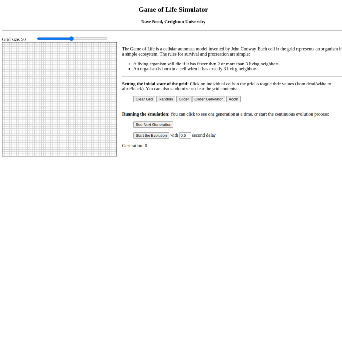 You can also randomize or clear the grid contents: Running the simulation: You can click to see one generation at a time, or start the continuous evolution process:
